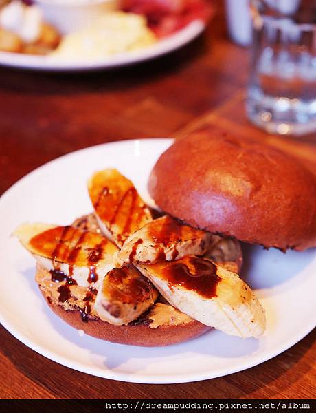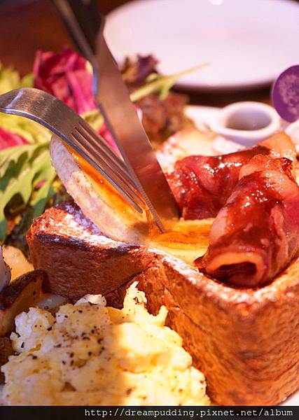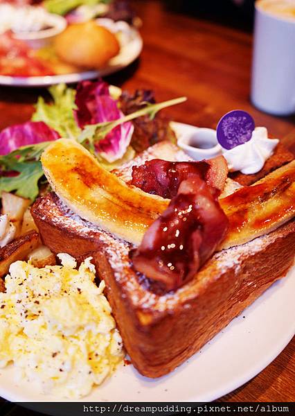 以酥皮丹麥吐司為主食,上面還有表皮附上微脆焦糖的軟熟香蕉,以及巧克力培根<---很神奇的巧克力培根,我都不知道巧克力醬跟培根還蠻搭的,鹹中帶點潤甜,培根又煎得微洽,是好吃的培根;此外還搭配了炒嫩蛋。