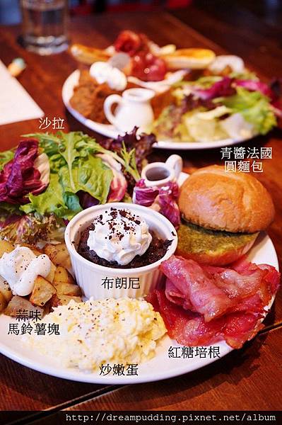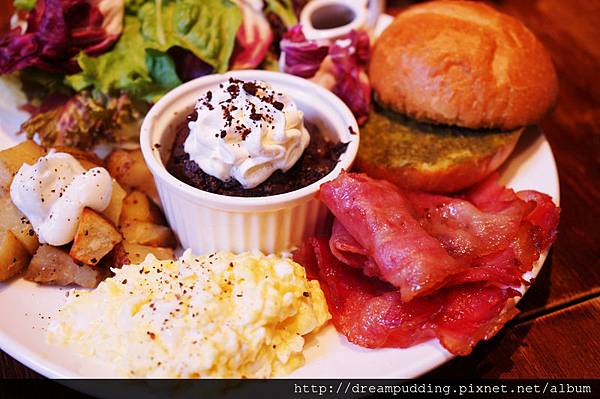 主食是現烤的熱騰騰布朗尼,法國圓麵包抹上了自製青醬,還有沙拉、蒜味馬鈴薯塊、炒嫩蛋跟紅糖培根。