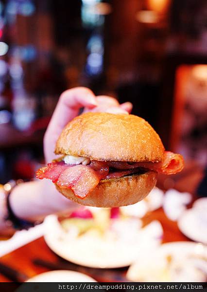 小圓麵包已經抹了青醬,可以再夾入煎的細微酥香的微甜培根跟滑嫩的炒蛋,略酥帶點微脆的法國麵包,一口咬下口感很有層次,而且有種飽滿的幸福感浮現。