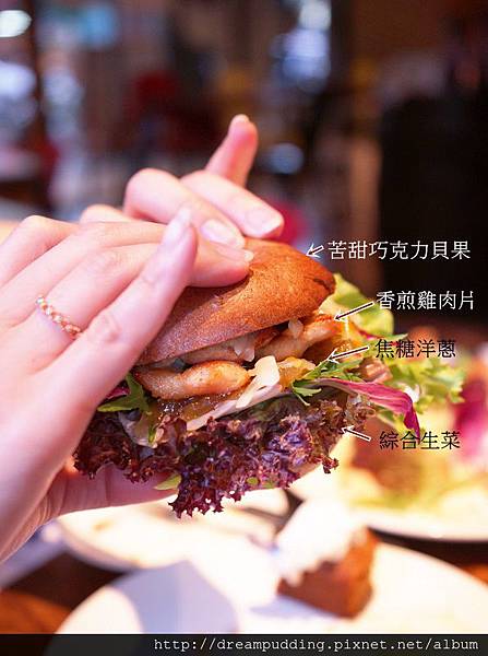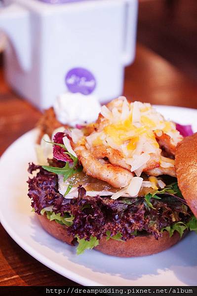 層層的疊起來一口咬下很有層次感,香煎雞肉片不會過乾,焦糖洋蔥濕潤的帶點甜味穿梭在其中很好吃,還有生菜的清爽,這組合我蠻喜歡的。