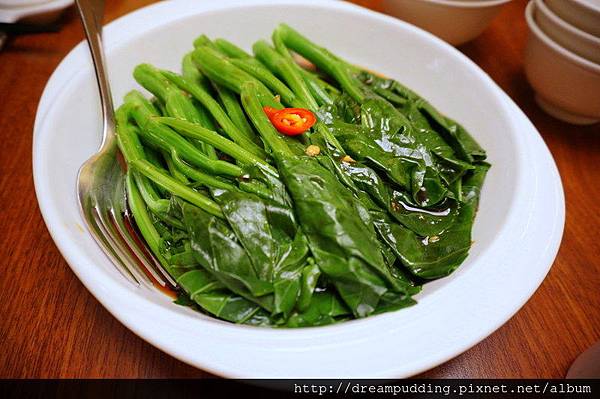 白灼廣東芥蘭,芥蘭看似粗枝大葉,實則細嫩微滑,而那看似淋上普通的清醬油,可是主廚加入特殊比例調的特製醬油,嘗起來有著自然的鮮鹹,不會有油膩感或是厚重。