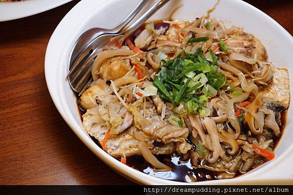 海鱸魚已經切成易食用的塊狀,單吃會有點膩,搭配一旁的酸菜跟菇一塊吃比較不膩口。