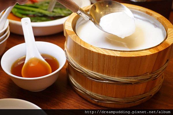 木桶豆花,可選擇冰熱,上回來吃熱的,這回來吃冰的,口感一樣香滑細緻,加入黑糖水風味更勝喔。