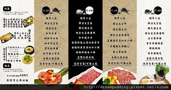 店內有套餐也有單點,套餐依價位有1480元(無牛套餐)、1680元、1980元跟2480元,都是雙人套餐,附餐有A(烤串類)、B(海鮮)、C(鍋物、薄餅)三種選擇。