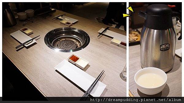 桌面整齊,醬汁有解膩的檸檬汁跟燒肉醬,也有一壺鮮美熱燙的雞湯,雞湯是可以無限續的喔。