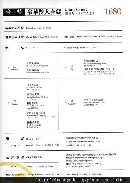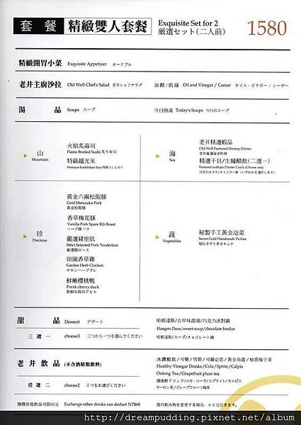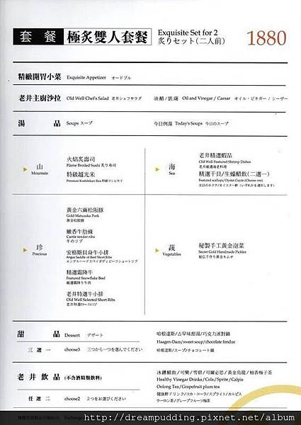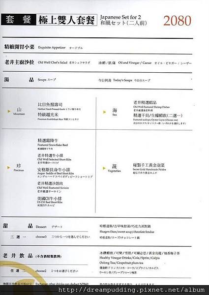因為這次是吃2080元的極上雙人套餐,所以就只在粉絲頁下載了雙人套餐的菜單,這是4月中旬用餐時的菜單,目前已經有更換新菜單了,所以有些餐點內容會有些不一樣喔!可以點選連結粉絲頁看最新的菜單。