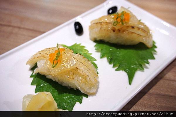 套餐附的比目魚握壽司,入口即化的比目魚真的很美味,搭著紫蘇葉一塊吃可解油膩。