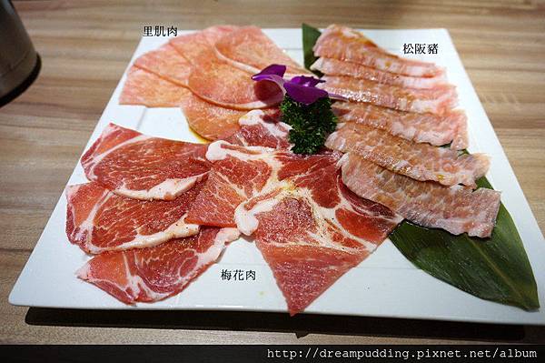 因為極上套餐都是牛肉,想吃豬肉的我們又加點的嚴選三品豬肉盤,有里肌肉、梅花肉跟松阪豬。我最愛松阪豬,烤起來微脆帶Q的口感很棒,里肌肉可能因為比較薄,油脂比較不多,所以比較容易黏網子。
