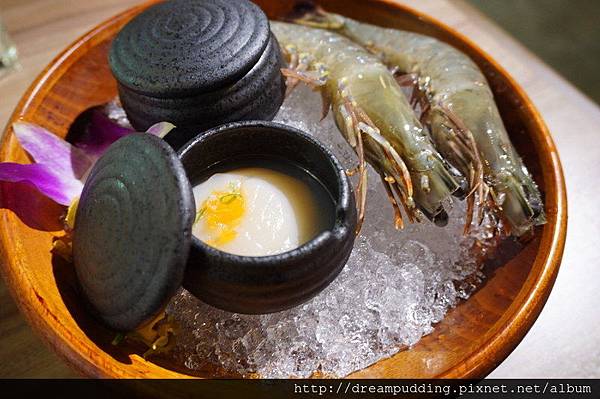 海鮮部分有附大蝦及干貝或生蠔醋飲二選一,我們都選擇干貝。