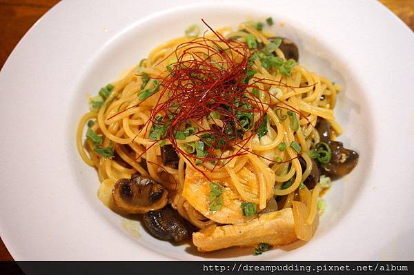 有許多爆香過後的蘑菇,吃起來帶有微甜的汁液,雞肉大塊不乾澀,麵條Q彈帶滑且入味,口感台式但吃起來卻很西式,辣椒絲有辣>////<,好吃。