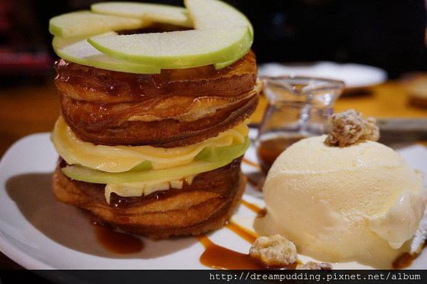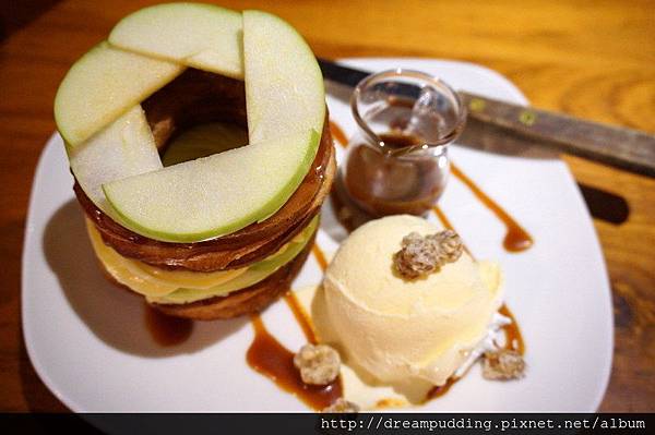 可頌圈吃起來微微的緊緻帶酥,不油膩,濃厚的卡士達醬略稠卻不會過甜,清蘋果清脆微酸帶著細微的甜,淋上焦糖後口感更加甜蜜,還有冰涼的香草冰淇淋,這我也超喜歡的!