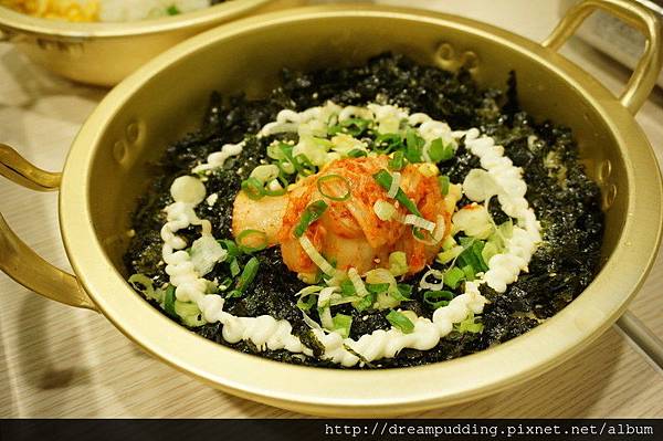 白米飯上面鋪滿了海苔,還夾了玉米粒,正中間放了泡菜,擠上一圈美乃滋再撒上蔥花。
