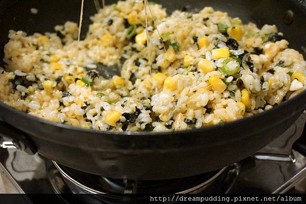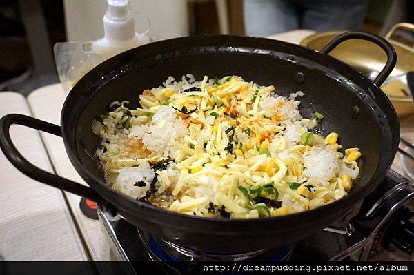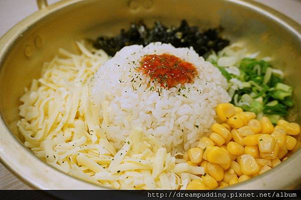 還有個特別的是,辣醬口味的年糕鍋可以再加購起司炒飯(NT 70元),吃完年糕鍋之後,留大約半碗湯汁,就可以再將起司炒飯下鍋拌炒。