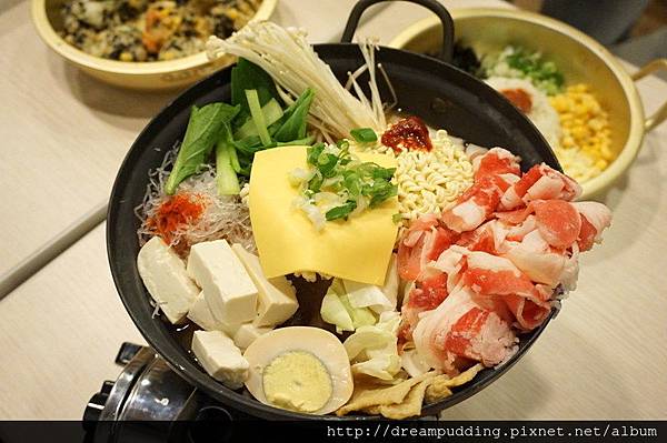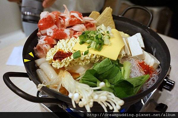 年糕鍋可以選擇辣醬跟牛奶口味,有豬肉、牛肉、海鮮跟部隊鍋4種口味可以選擇;基本鍋底為韓國魚板、年糕、水煮蛋、蔬菜、青蔥、豆芽、洋蔥、金針菇及Q麵,其他配料可以依喜好加點,我們都多加了10元的起司片。