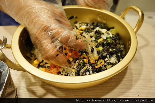 成為團團圓圓的拳頭飯口感溫熱,有海苔的香跟泡菜的微辣,還有玉米粒細微的清脆,跟蔥花的提味,這個我還蠻喜歡的。