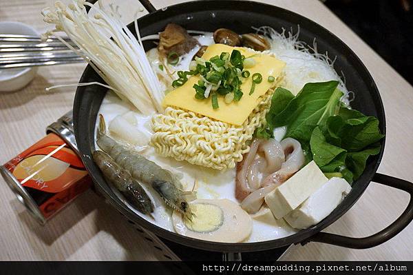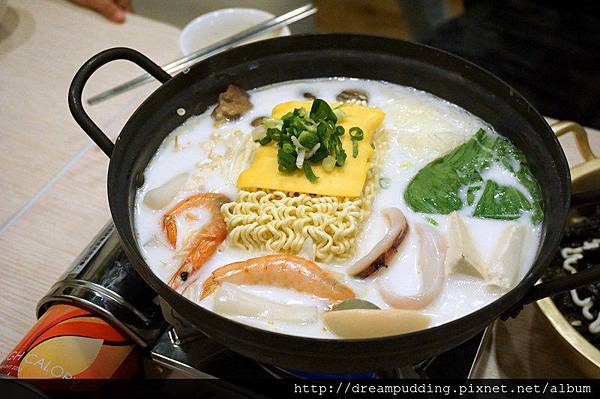 這個是海鮮年糕鍋牛奶口味(NT 220元),加起司片(NT 10元)。