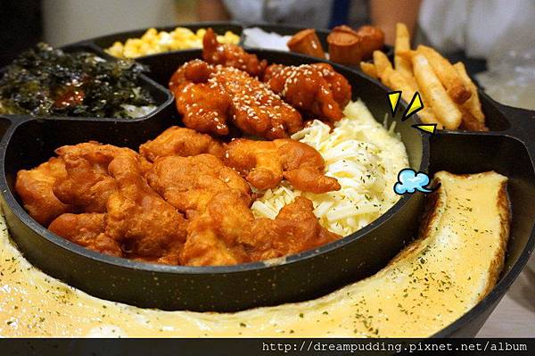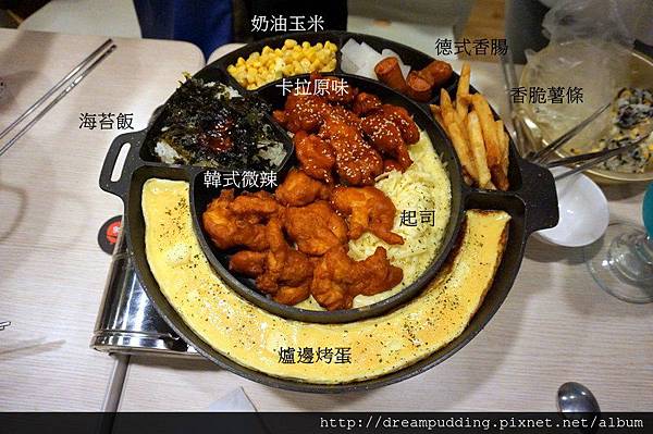 鍋裡有半圈爐邊烤蛋、海苔飯、奶油玉米、醃蘿蔔、德式香腸、香脆薯條;正中間有著原味跟韓式微辣口味,是說我現在寫到才發現我把炸雞口味標顛倒了(暈),有芝麻點點的炸雞是韓式微辣才對,沒有芝麻點點的炸雞是卡拉原味喔!