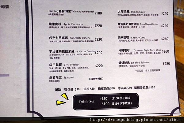 鬆餅的口味有甜有鹹,季節限定會有另外的DM,點鬆餅可以加價選購飲料,加價50元可以選購100元以下的飲料,加價100元則可以選擇150元以下的飲料,而一些品項也能另外加點。
