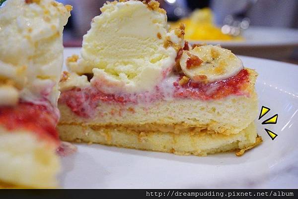 鬆餅間夾著花生醬,最上頭再鋪上覆盆子醬、培根,還有花生焦糖脆片跟生焦糖輕海鹽醬,最上面還有香蕉切片跟一球香草冰淇淋,口感鹹甜交織,花生醬不會濃郁到搶了風味,覆盆子醬也不會過酸,這個我也挺喜歡的。