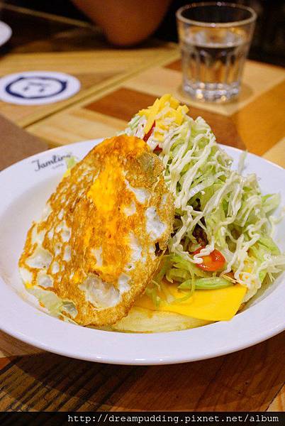 有墨西哥豬肉醬、生菜、起司跟荷包蛋。