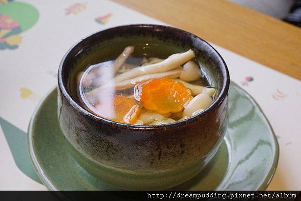 這天的湯是由高麗菜跟雞肉絲還有紅蘿蔔及白精靈菇下去熬煮的湯,湯的口感很自然,高麗菜清脆,可惜的是雞肉絲有點乾澀>////<