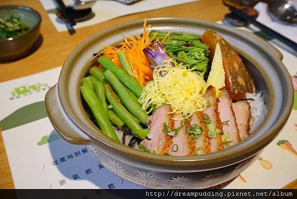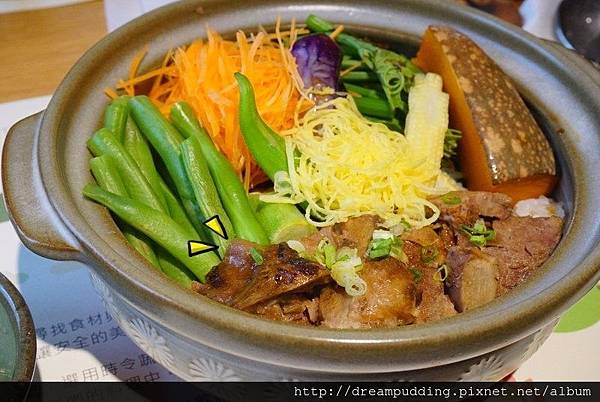 這天鍋裡的蔬菜有四季豆、紅蘿蔔絲、茄子、龍鬚菜、南瓜、玉米筍、蛋絲跟豬肉,青菜都新鮮自然,燉煮的熟軟度剛剛好,玉米筍好清甜,我很愛;豬肉口感軟中帶Q還有些微的緊緻,燉煮的十分入味,口感有些微的像牛肉,最愛那甜甜的醬汁,搭配霧峰香米的米粒晶瑩飽滿,口感超棒的!