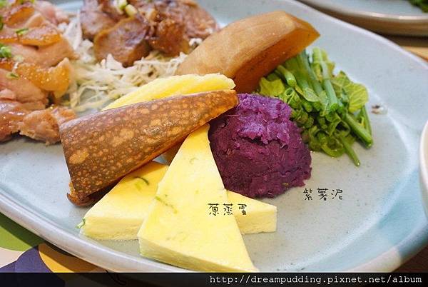 配菜部分也比350元套餐多上一些,紫薯泥的口感很自然,有著些微的纖維,口感樸實,很有大甲芋頭酥的FU阿;蔥蒸蛋好吃,有著自然的微鹹甜潤