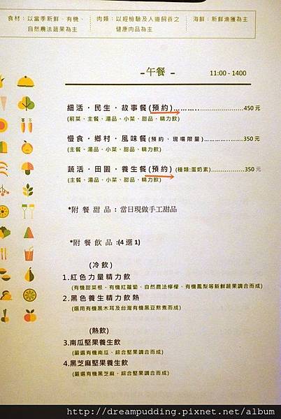 館內的午餐餐點主要採預約制,分為三種,分別是450元的故事餐、350元的風味餐跟蛋奶素食的養生餐,350元的風味餐現場有限量供應,但份數不一定,所以建議在訂餐時也一起預約比較保險。