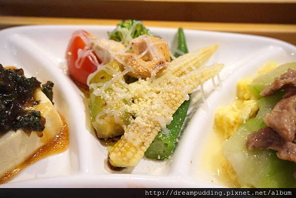 配菜之二是在玉米筍、楊桃、小番茄、秋葵上拌上橄欖油跟巴薩米可醋,再加上美乃滋跟起司粉,還吃得到腰果,口感濃郁清甜帶著甜潤跟潤澤,很有層次感,口感豐富。