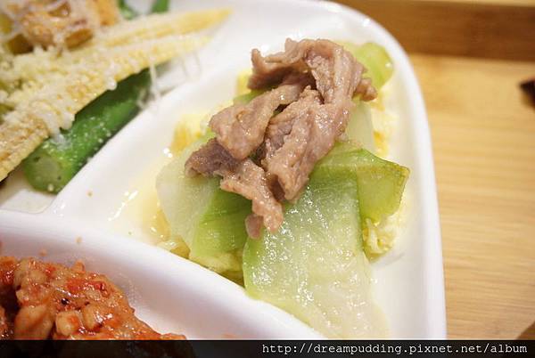 另一個配菜是絲瓜炒蛋,還加了肉絲增加口感及香味,是說特別的是,滴了些許麻油,讓口感更加迷人且潤澤。