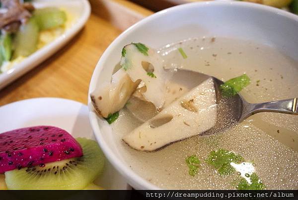 蓮藕湯清爽卻有著濃郁感,口感脆中帶Q,香菜的辛香增加了風味。