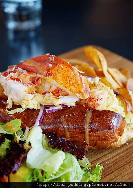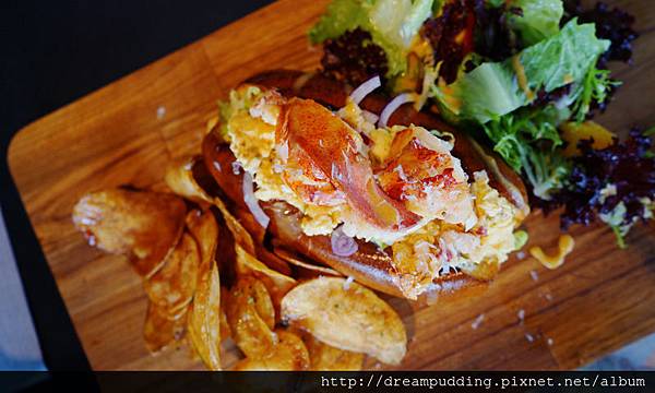 麵包採用潛艇堡,中間夾著波士頓龍蝦、龍蝦腦炒蛋,上頭還淋上海膽醬,一旁還附了有機生菜沙拉及炸薯片。