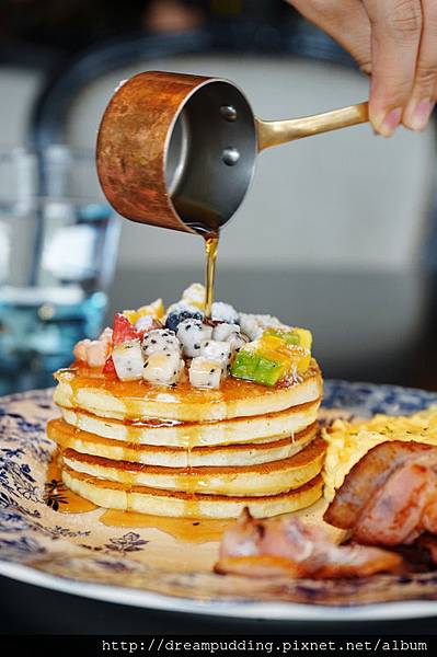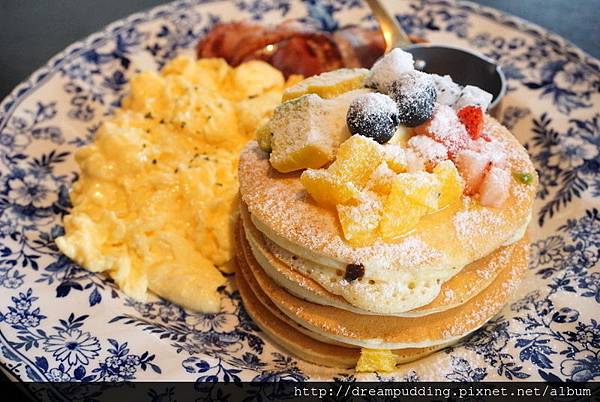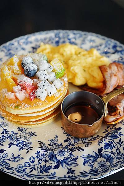 鬆餅屬美式鬆餅,採用法國A.O.C奶油製作,還有培根、炒蛋,也附上了一盅加拿大楓糖漿。