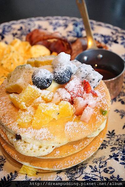 鬆餅上面有著季節水果點綴,有我喜愛的酪梨耶