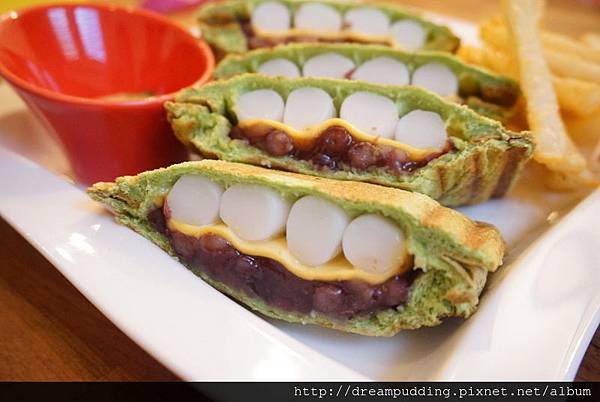 採用抹茶口味的吐司下去熱壓,裡面包了Q軟的年糕跟綿密帶點顆粒感的紅豆泥,還有鹹香的起司片。
