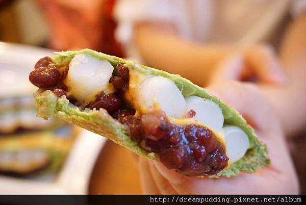 抹茶吐司口感薄帶酥,味道清新有著香濃的抹茶味,搭著香甜的紅豆泥,微鹹的起司還有年糕的軟Q,整體吃起來很好吃,我們都非常喜歡,下次來還會想要再點她。