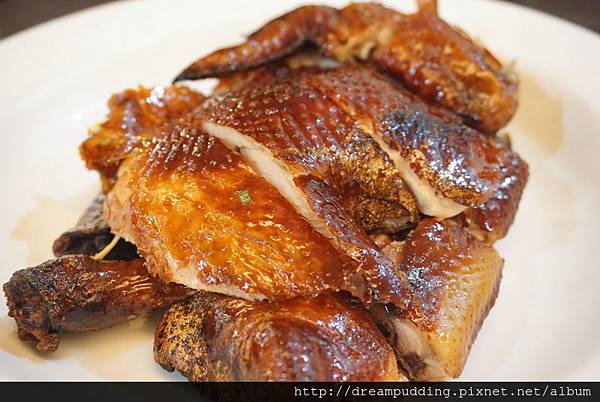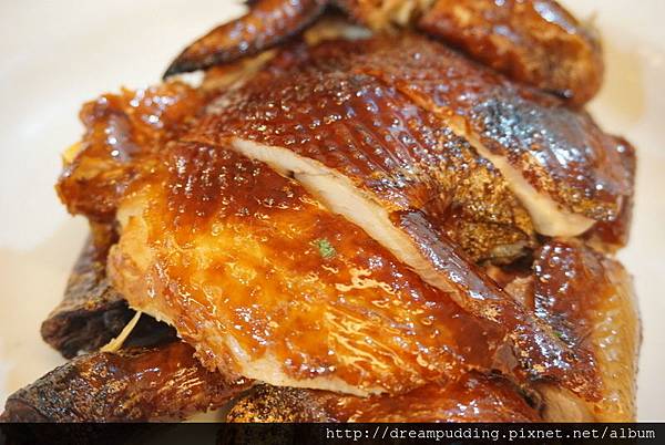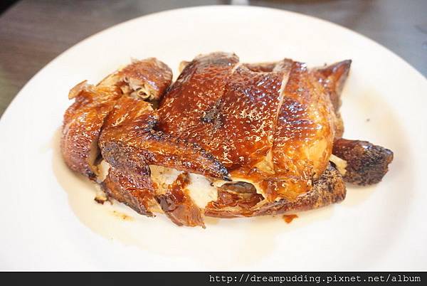 脆皮雞的雞皮很脆,雞肉口感不柴,有著微微的油脂。