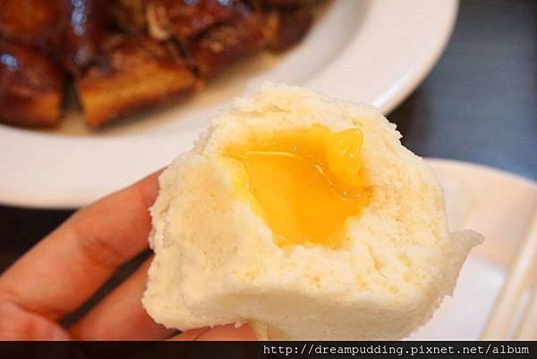 流沙包的外皮比較厚,蓬鬆中有著綿厚粉感,包子皮本身比較不合我胃口,但是他的內餡我很喜歡,微稠的熱燙,有著鹹蛋黃的微沙,香甜帶著自然的鹹,是好吃的內餡。