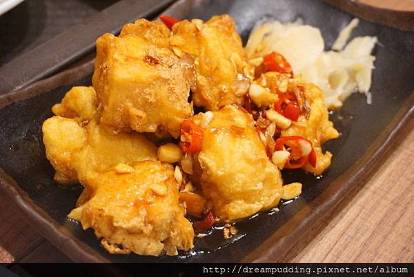 豆腐大塊,外皮炸的酥脆,內部軟燙,醬汁甜中帶辣,是好吃的炸豆腐,我很喜歡。