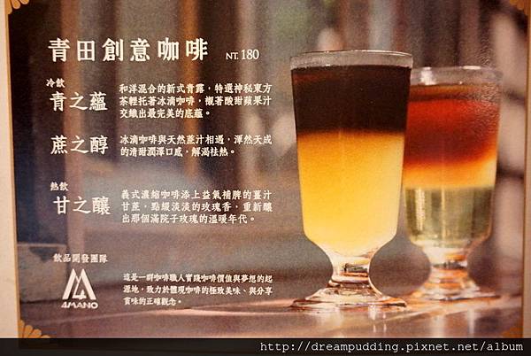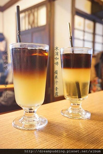 圖右的青之蘊為冰滴咖啡、蘋果汁及東方茶青露的三重奏,有著咖啡香氣及青露的清香雅致還有蘋果汁的酸甜,口感很有層次阿,這兩杯我們都很喜歡呢!