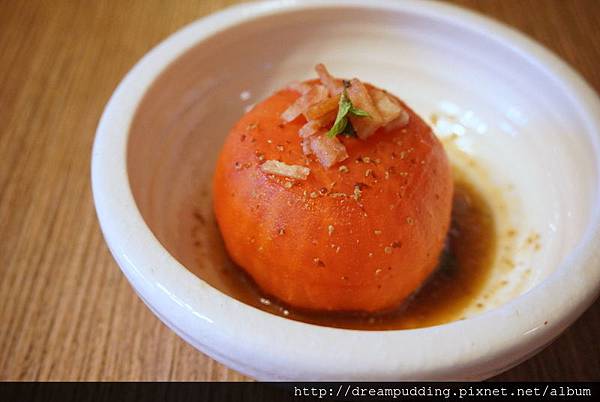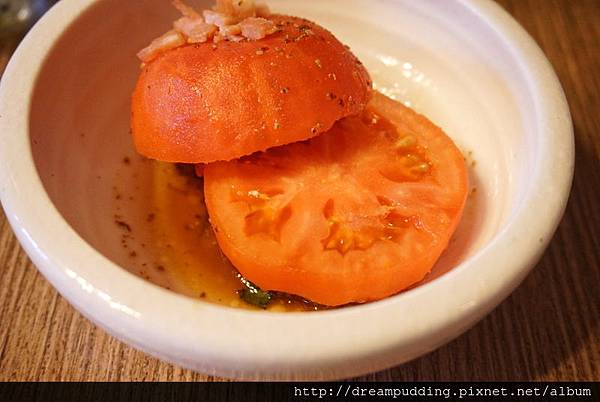 大顆的牛番茄汁液飽滿,口感新鮮,上頭撒了培根末還有些許辛香料,增加了清爽感。