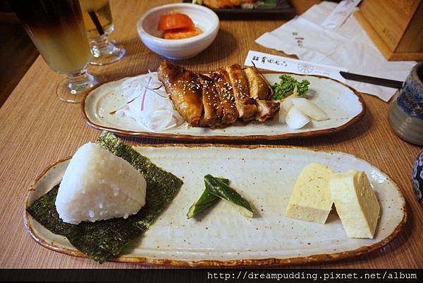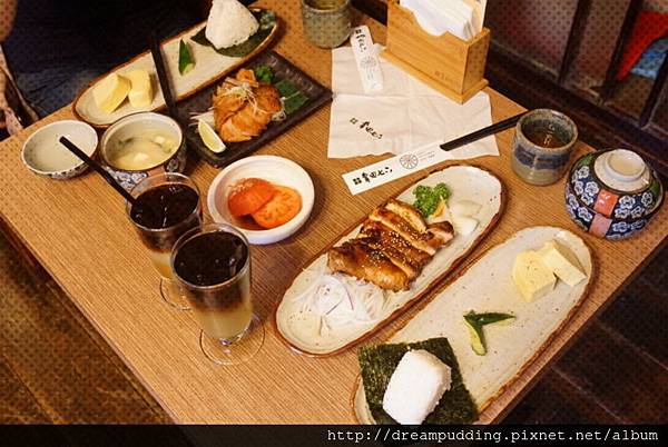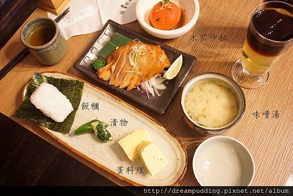 整個套餐水茄沙拉、飯糰、漬物、蛋料理、味噌湯跟甜點,圖右上的飲料是我們另外單點的,餐點上桌時,服務生有說味噌湯跟飯糰如果吃不夠可以再跟他說,所以應該是能免費續加,但是能續幾次我就不知道了>////<,因為我跟友人吃完就飽了,沒有胃能再續飯糰跟味噌湯>。<