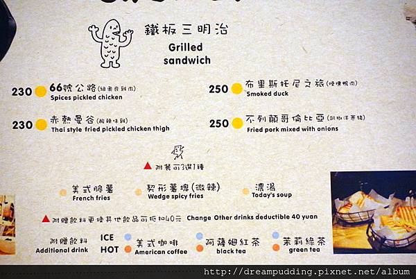 早午餐類的鐵板三明治附餐可選擇薯條或濃湯,還有附飲料。