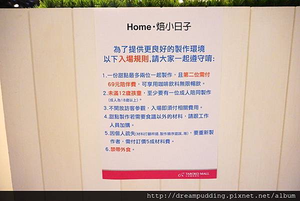 入口處貼著入場規則。一份甜點最多兩位一同製作,陪同的那位只要69元陪伴費就可以咖啡飲料無限暢飲。