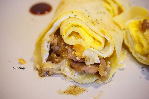 蛋餅皮微微的酥,厚度剛好,略有嚼勁;採用溫體豬肉,加的是PIZZA使用的起士,整體口感香濃,芝麻香比較沒那麼明顯,一旁沾附的醬油甜中帶鹹,是好吃的蛋餅阿。
