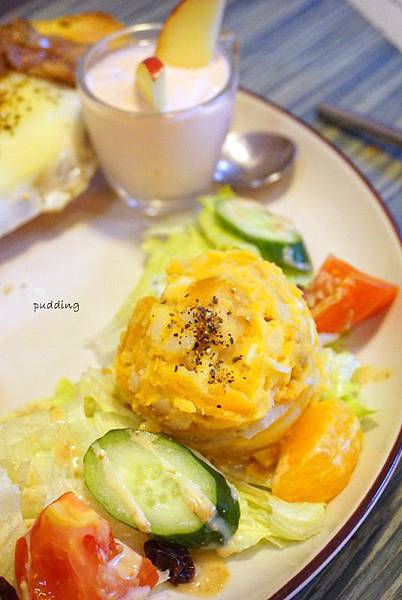 薯泥沙拉加了蛋白塊跟地瓜泥,略帶甜味的很有口感,後方的甘味小食這天附的是草莓優格,甜香帶點細微的酸。
