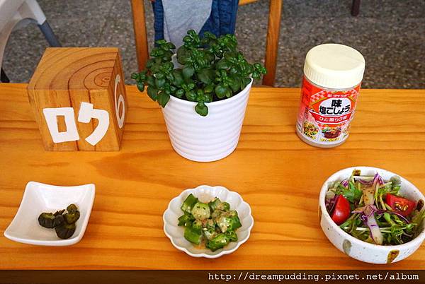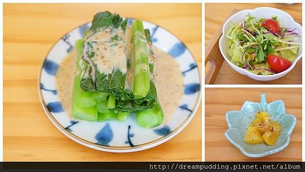 喜歡青菜水煮後搭胡麻醬的濃郁中保有清爽的味道;和風沙拉也很開胃;醃漬的地瓜口感微甜我也很愛。