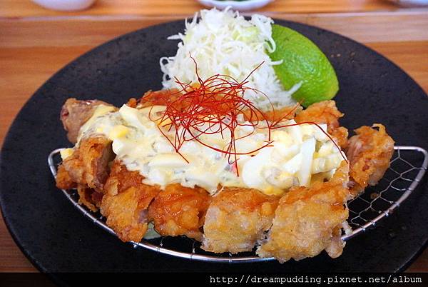 雞腿排酥炸後淋上南蠻醋汁,外酥內厚實的嫩彈口感,再加上潤甜的塔塔醬,搭著豔紅的辣椒絲調味,口感豐富,好吃。