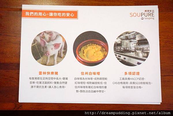 有兩張卡片,一張是介紹湯品使用的食材來源(這很重要)