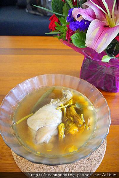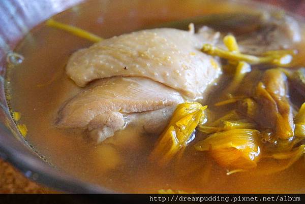 雞肉是給一整支的雞腿肉,口感緊實帶Q且嫩,金針花增加了清甜脆感,剝皮辣椒讓湯有著清甜的辣,我愛極了。